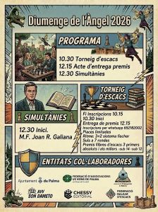 Com cada any celebrarem el proper diumenge 12 d’abril del 2026 a partir de les 10.30 hores activitats d’escacs dins les festes del diumenge de l’àngel al Castell de Bellver. Agrair a totes les Institucions que fan possible any rere any que tinguem una festa d’escacs en un marc tan incomparable, la Federació d’Associacions de Veïns de Palma, l’AVV Son Dameto, l’Associació d’escaquistes de Balears i la Chessy Editorial amb el patrocini de l’Ajuntament de Palma.